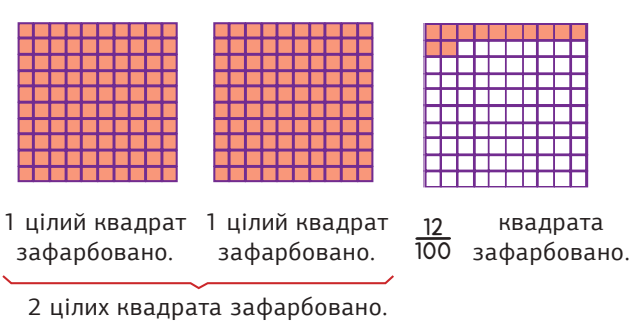 квадрата зафарбовано. Це читають як три сотих. У вигляді десяткового дробу це записують так: